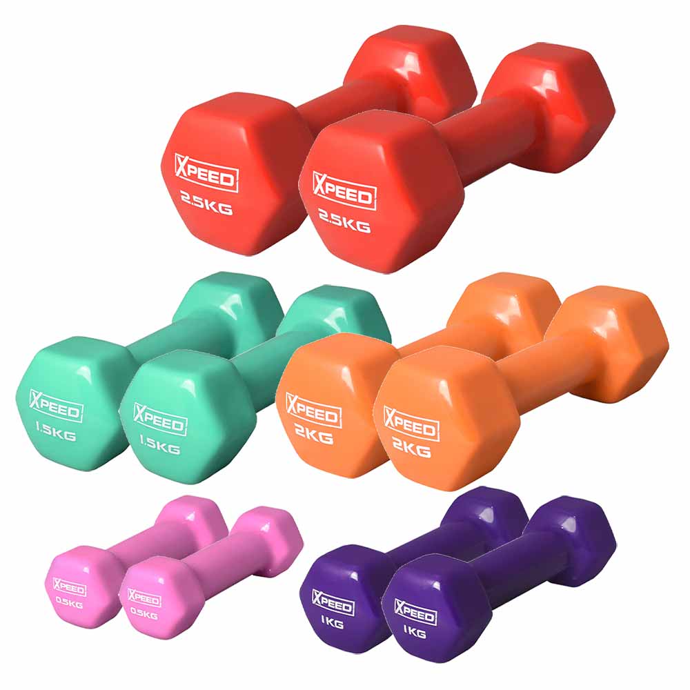 Life gets better when you simplify, that's exactly what Xpeed has done with this PVC dumbbell set. Build muscle mass and maintain your upper body strength from home with these dumbbells. Great whether you are weight training or just staying fit, these weights are dipped in coloured PVC so they are comfortable to handle as well as providing good grip for sweaty hands.