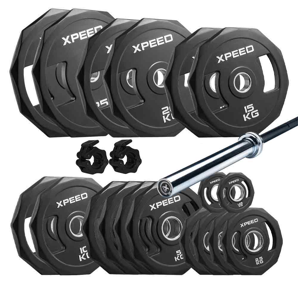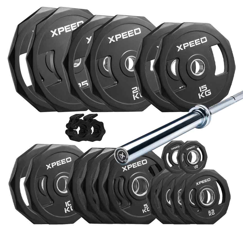 This 172.5kg Olympic rubber plate and bar package is the perfect bundle for a new lifter. With the Xpeed D-Series Olympic Barbell, alongside the high quality Xpeed Olympic Rubber Plates, you'll have the best start you need for you strength gaining journey.
